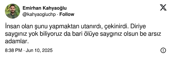 İnsan olan şunu yapmaktan utanırdı, çekinirdi. Diriye hürmetiniz yok biliyoruz da bari ölüye hürmetiniz olsun be arsız adamlar.’