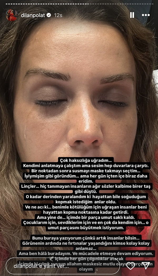 Dilan Polat ise son paylaşımında dua ederek şöyle dedi: “İyileşmek istiyorum Allah’ım. Kimsenin beni artık yormasını istemiyorum. Bunu en çok çocuklarım için istiyorum. Ne yapacağımı bilmiyorum. Bana yol göster…”