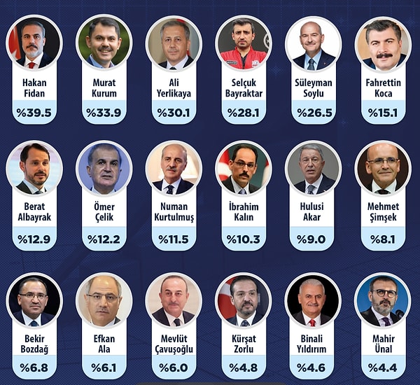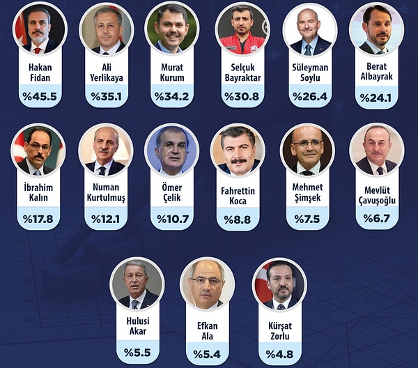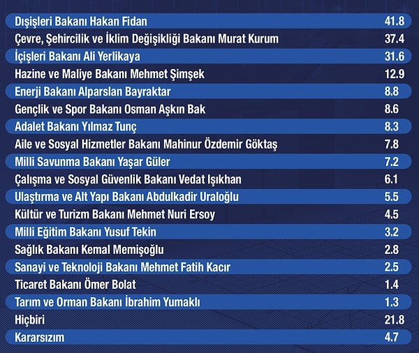 Mevcut hükümette şu an vazifede olan bakanlar ortasından en beğenilen ve en başarılı bulunan isimlerin hangileri olduğuna ait dağılım incelendiğinde % 41.8 Dışişleri Bakanı Hakan Fidan’ı işaret ederken, % 37.4’ü Etraf, Şehircilik ve İklim Değişikliği Bakanı Murat Kurum olduğunu söyledi. (Cumhurbaşkanı Sayın Recep Tayyip Erdoğan’ın dışında sorulmuştur.)