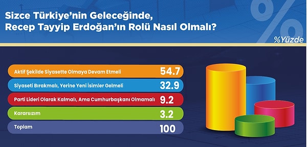 Türkiye’nin geleceğinde, Recep Tayyip Erdoğan’ın rolünün nasıl olması gerektiği ile ilgili görüşler incelendiğinde % 54.7’si faal biçimde siyasette olmaya devam etmesi gerektiğini söz ederken % 9.2’si parti başkanı olarak kalmalı lakin Cumhurbaşkanı olmaması gerektiğini söz etti.