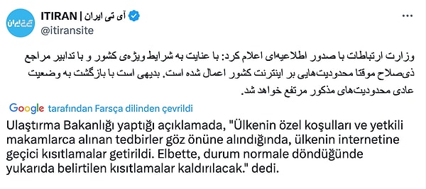 İran Ulaştırma Bakanlığı’ndan yapılan açıklamaya nazaran; İsrail’in akınları nedeniyle alınan önlemlerden biri olarak internet kullanımına kısıtlama getirildi. Ulaştırma Bakanlığı “Ülkenin özel koşulları ve yetkili makamlarca alınan önlemler göz önüne alındığında, ülkenin internetine süreksiz kısıtlamalar getirildi. Elbette, durum olağana döndüğünde üstte belirtilen kısıtlamalar kaldırılacak” açıklamasını yaptı.