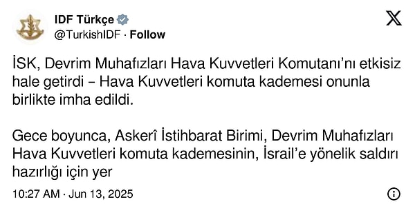 İsrail Savunma Kuvvetleri’nin Türkçe hesabından paylaşım yapıldı.