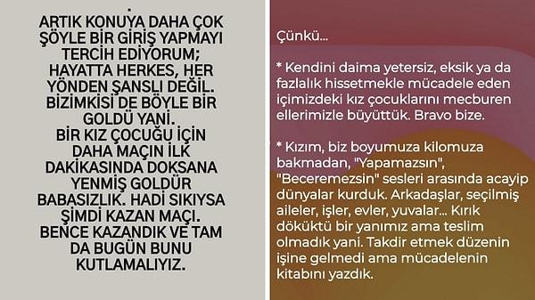 “Bugün kendimizi kutluyoruz kızlar” diyen Özyılmazel’in yazısı okuyanı derinden sarstı.