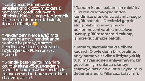 ‘Kızım, biz boyumuza, kilomuza bakmadan, yapamazsın, beceremezsin sesleri ortasında acayip dünyalar kurduk. Arkadaşlar, seçilmiş aileler, işler, konutlar, yuvalar, kırık döküldü bir yanımız lakin teslim olmadık yani. Takdir etmek tertibin işine gelmedi lakin gayretin kitabını yazdık.