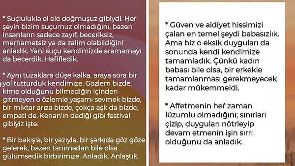 ‘Bir ölçü arıza bizde, çokça aşk da bizde, empati de. Kenan’ın dediği üzere, şenlik üzereyiz işte. Bir bakışla, bir yazıyla, bir müzikte, göz göze gelerek, bazen tanımadan bile olsa, gülümsedik birbirimize, anladık, anlaştık. İnanç ve ailet hissimizi çalan en temel şeydi babasızlık. Lakin biz o eksik hisleri da sonunda kendi kendimize tamamladık. Zira bayan babası bile olsa, bir erkekle tamamlanması gerekmeyecek kadar harikaydı. Affetmenin her vakit gerekli olmadığını, hudutları çizip hisleri nötrleyip devam etmenin işin sırrı olduğunu da anladık.’