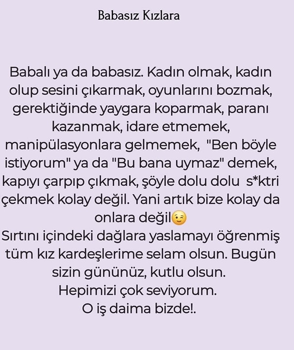 ‘Kadın olmak, bayan olup sesini çıkarmak, oyunlarını bozmak, gerektiğinde yaygara koparmak, paranı kazanmak, yönetim etmemek, manipülasyonlara gelmemek, ben bu türlü istiyorum ya da bu bana uymaz demek, kapıyı çarpıp çıkmak, şöyle dolu dolu s*ktiri çekmek kolay değil. Yani artık bize kolay doğumlara değil. Fırtına içindeki dağlara yaslamayı öğrenmiş tüm kız kardeşlerime selam olsun. Bugün sizin gününüz. Kutlu olsun. Hepinizi çok seviyorum. O iş sürekli bizde!.’