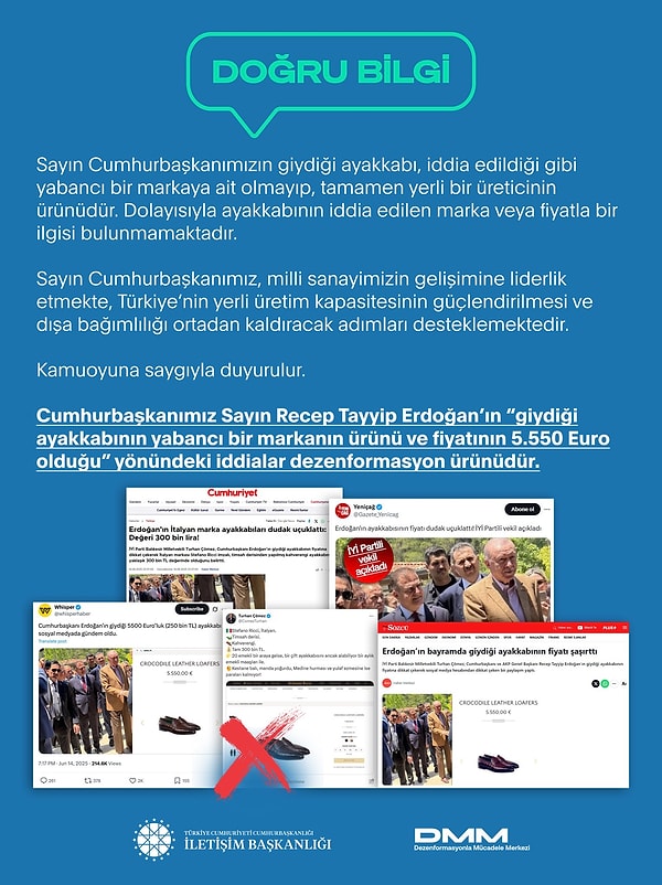 Dezenformasyonla Gayret Merkezi (DMM) Cumhurbaşkanı Erdoğan’ın ayakkabısının ismi geçen markadan olmadığını ve fiyatının da sav edildiği üzere 5 bin 550 euro olmadığını açıkladı.