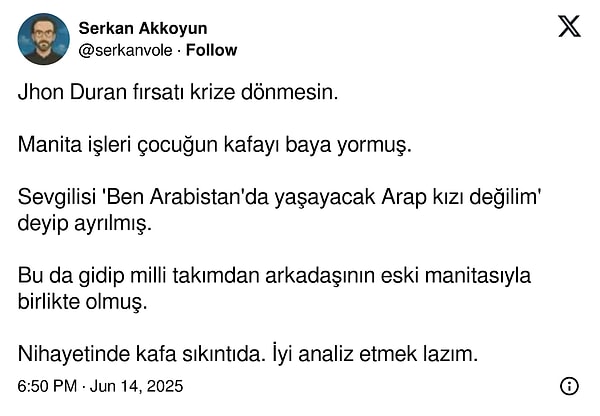 Yorumcu Serkan Akkoyun da Duran’ın mümkün transferine ait paylaşımda bulunarak oyuncunun aşk hayatına dikkat çekti: