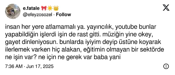“çok farklı bi öyküm var, 15 saniyelik görüntüler çekerek başladım çok kısa bir müddette olsa yayıncılık yaptım sonrasında instagrammer/youtuber oldum artık ise müzikçi ve şu andada oyuncu mu olsam diyorum. ne diyosunuz olur mu benden? olur da tekrar fikrinizi alayım.” biçimindeki açıklaması adeta yangına körükle gitti.