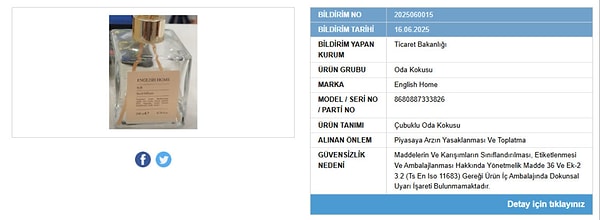 Ticaret Bakanlığı’nın ‘güvensiz’ kategorisine aldığı eserleri ifşası devam ederken satışı yasaklanan son eser ünlü bir markaya ilişkin çıktı. ‘English Home’ marka çubuklu oda kokusunun piyasaya arzı yasaklandı ve eserlerin toplatılmasına karar verildi.