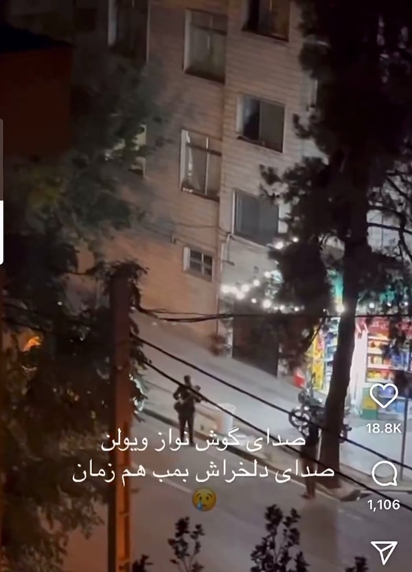 Sosyal medyada paylaşılan bir görüntü ise adeta sinema sahnesinden fırlamış üzere. İranlı bir müzisyen, bombaların seslerini duymamamaları için komşularına sokakta kemanla resital verdi.