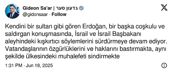 İran’a atak düzenleyerek bir kere daha Orta Doğu’da tansiyonu en üst düzeye çeken İsrail’in Dışişleri Bakanı Gideon Saar, sosyal medyada Türkçe olarak yaptığı paylaşımda Cumhurbaşkanı Recep Tayyip Erdoğan’ı hedef aldı.