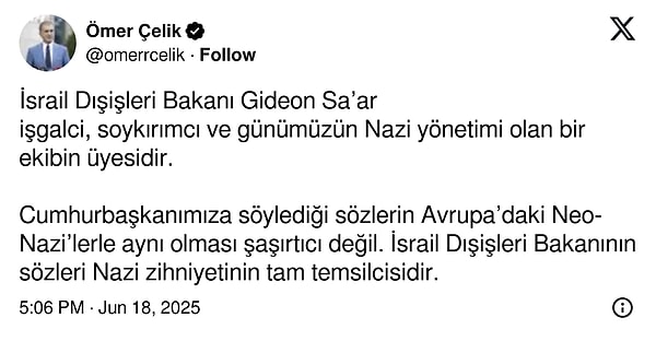 ‘İsrail Dışişleri Bakanı Gideon Sa’ar işgalci, soykırımcı ve günümüzün Nazi idaresi olan bir grubun üyesidir.