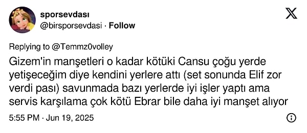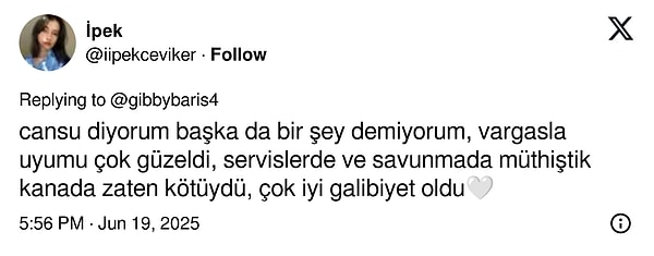 Kanada’yı 3-0 mağlup ederek Milletler Ligi’ndeki galibiyet serisini 6 maça çıkaran, bir rakibini daha parkeden eli boş gönderen Filenin Sultanları’nın çabası voleybolseverlerden tam not aldı. Oyuncularımızın harikulade performansı, toplumsal medyada alkış topladı.