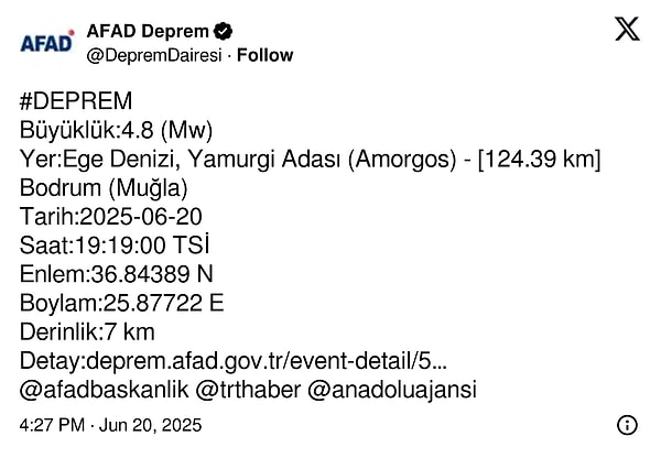 Deprem saat 19.19’da gerçekleşti. Ege Denizi’nde gerçekleşen sarsıntının derinliği 7 kilometre olarak açıklandı. Sarsıntının merkezi ise Ege Denizi, Yamurgi Adası (Amorgos) olurken Bodrum’a 124.39 kilometre uzaklıkta olduğu belirtildi.