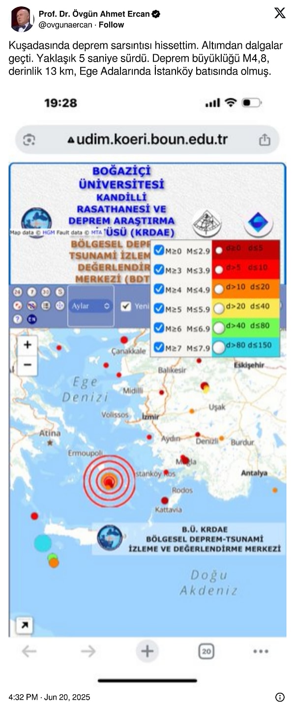 ‘Kuşadası’nda zelzele sarsıntısı hissettim. Altımdan dalgalar geçti. Yaklaşık 5 saniye sürdü. Sarsıntı büyüklüğü M4,8, derinlik 13 km, Ege Adalarında İstanköy batısında olmuş.’