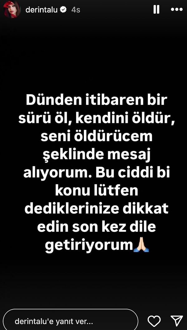 Defne Samyeli’nin kızı Derin Talu, toplumsal medyada yaptığı son paylaşımla tehdit iletileri aldığını açıkladı.