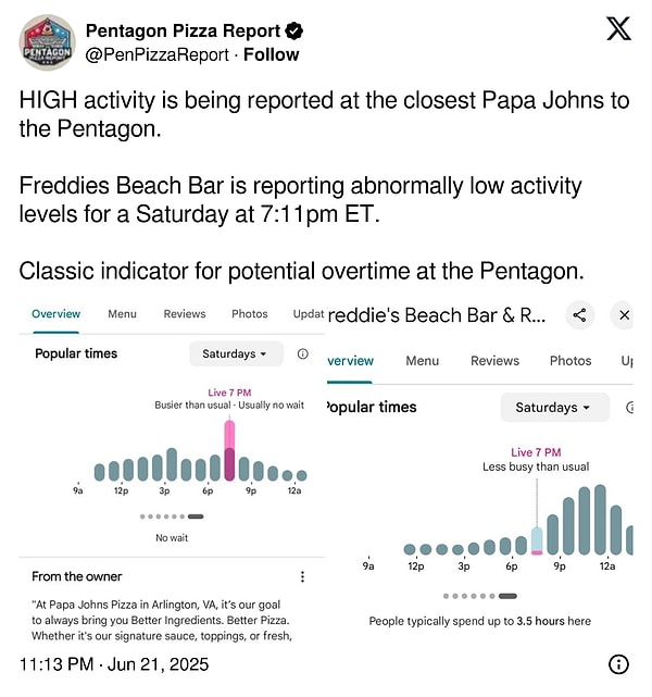ABD Başkanı Donald Trump’ın saldırıyı duyurmasından yaklaşık bir saat evvel platform, ‘Pentagon’a en yakın Papa Johns zincirinde YÜKSEK hareketlilik var. Ayrıyeten Freddies Beach Bar’da ise Cumartesi akşamına nazaran çok düşük bir hareketlilik var. Bunlar Pentagon’dakilerin mesaiye kaldığının klasik potansiyel göstergeleri’ denildi.