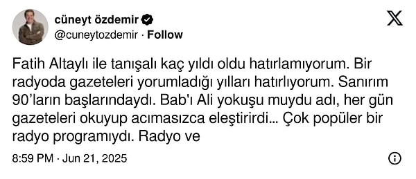 ‘Fatih Altaylı ile tanışalı kaç yıldı oldu hatırlamıyorum. Bir radyoda gazeteleri yorumladığı yılları hatırlıyorum. Sanırım 90’ların başlarındaydı. Bab’ı Ali yokuşu muydu ismi, her gün gazeteleri okuyup zalimce eleştirirdi… Çok tanınan bir radyo programıydı. Radyo ve televizyonların yeni şaha kalktığı günlerdi.