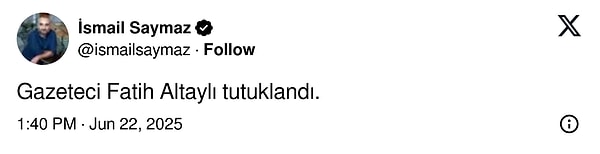 Altaylı’nın tutuklanma kararını Gazeteci İsmail Saymaz duyurdu.