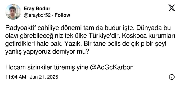 “Radyoaktif cahiliye devri tam da budur işte. Dünyada bu olayı görebileceğiniz tek ülke Türkiye’dir. Koskoca kurumları getirdikleri hale bak. Yazık. Bir tane polis de çıkıp bir şeyi yanlış yapıyoruz demiyor mu?