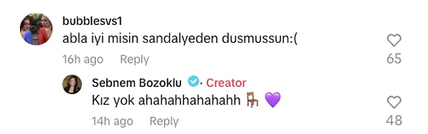 Ünlü oyuncunun paylaşımını gören bir kullanıcıysa “Abla yeterli misin sandalyeden düşmüşsün:(” diye sordu. Şebnem Bozoklu da bu soruyu karşılıksız geçmeyip “Yok kız” diyerek güldü.